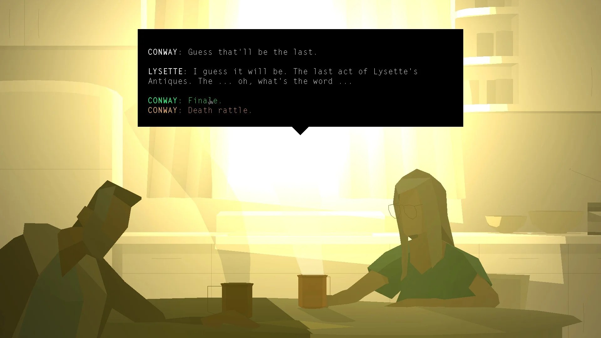 It’s taken me a couple of months of protracted slow progress to finally finish Kentucky Route Zero – I finally saw credits last week – and I’ve been ruminating on some thoughts about game dialogue systems. So since I’m now getting dragged into the high-adrenaline loop of Marathon, it seemed an appropriate time to sit down and try to structure some impressions on game narratives and more specifically – game dialogue.